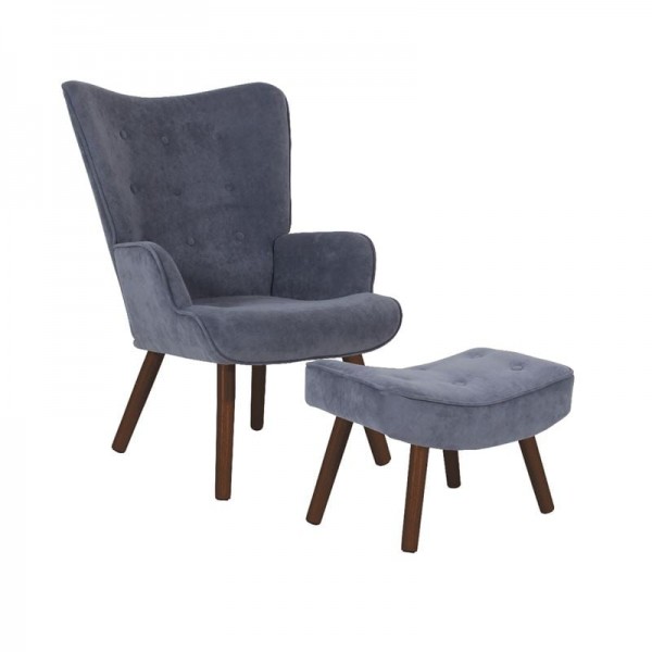 Πολυθρόνα - Μπερζέρα με Σκαμπό - Υποπόδιο Καρυδί Ύφασμα Velure Ανοιχτό Μπλε,K/D