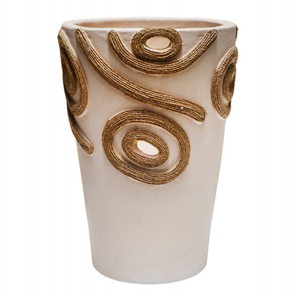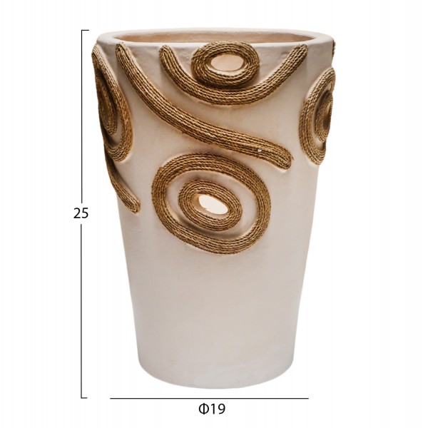 Το επιτραπέζιο χειροποίητο διακοσμητικό βάζο DEAN είναι λιτό σε κλασσικό σχέδιο. Είναι κατασκευασμένο εξολοκλήρου από τερακότα σε ΚΡΕΜ χρώμα ενώ διαθέτει διακοσμητικά σχέδια με σχοινί από ίνες φοίνικα κολλημένο στις πλευρές του βάζου. Ιδανικό για πληθώρα χώρων, τόσο για το σπίτι, όσο και για επαγγελματικούς χώρους.