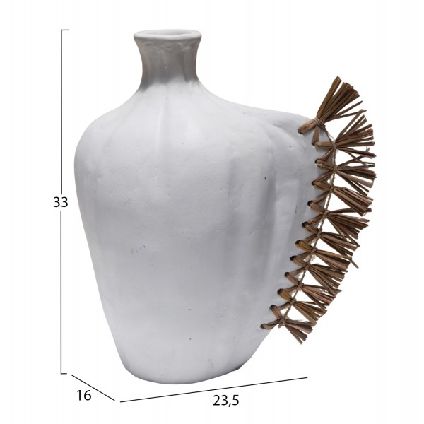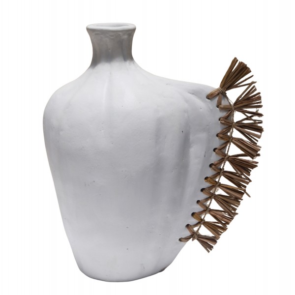 Το επιτραπέζιο χειροποίητο διακοσμητικό βάζο JEBB διαθέτει στενό στόμιο και είναι ένα πολύ ιδιαίτερο διακοσμητικό στοιχείο για κάθε χώρο. Ακολουθώντας την τελευταία τάση στην εσωτερική διακόσμηση, είναι κατασκευασμένο εξολοκλήρου από σχεδόν σαγρέ τερακότα σε ΛΕΥΚΟ χρώμα, ενώ στην μία πλευρά διαθέτει διακόσμηση με αποξηραμένο grass.