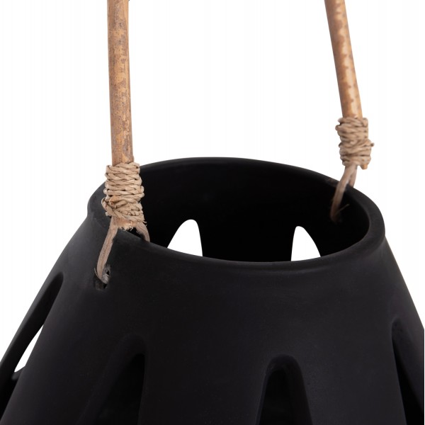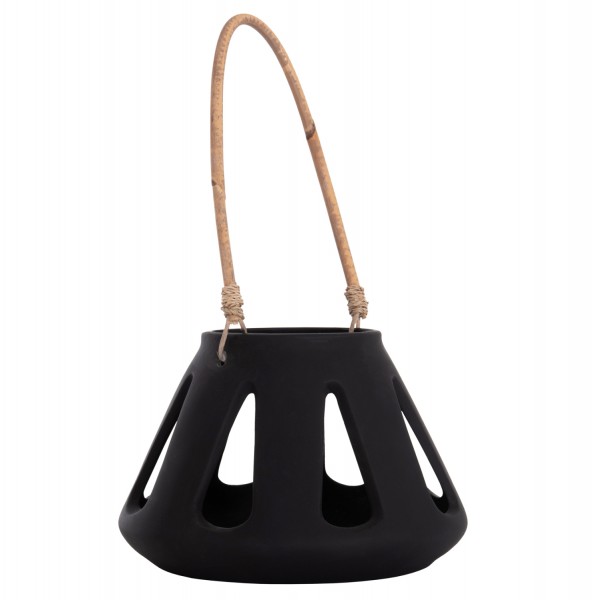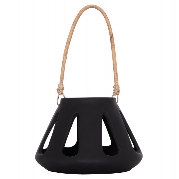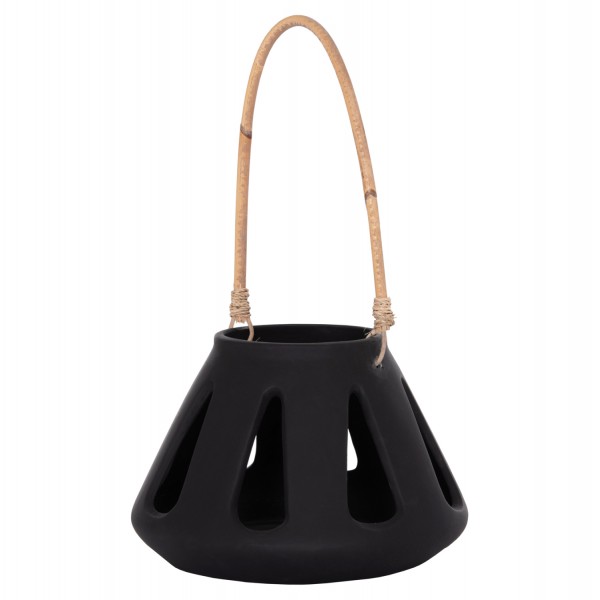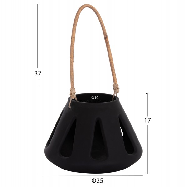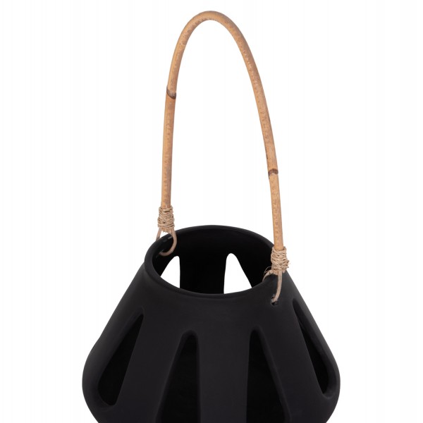 Το χαμηλό επιτραπέζιο διακοσμητικό φανάρι ERANTYL είναι κατασκευασμένο από Fiber Cement σε ΜΑΥΡΟ χρώμα και διαθέτει χερούλι από φυσικό rattan για εύκολη μεταφορά. Το Fiber Cement ΔΕΝ είναι εύφλεκτο, που σημαίνει ότι μπορείτε να τοποθετήσετε αρκετά είδη κεριών, ωστόσο συνιστάται ΠΑΝΤΑ αυτό να γίνεται με μεγάλη προσοχή.