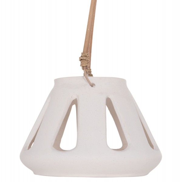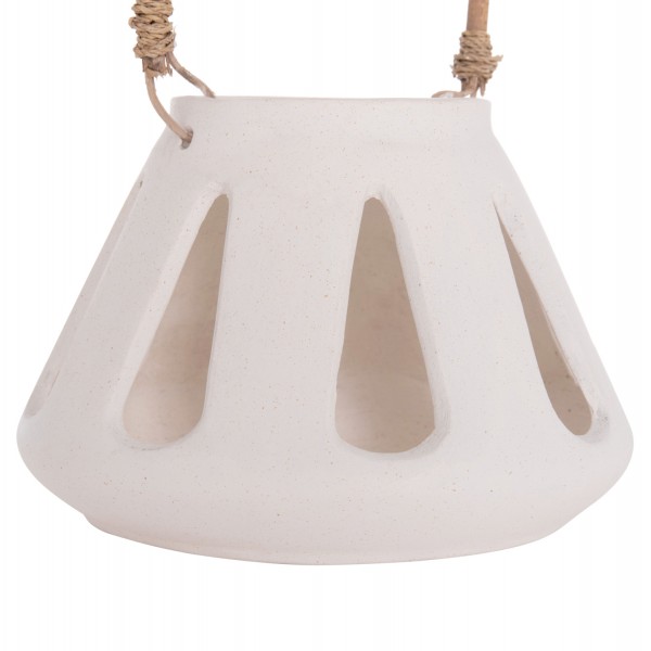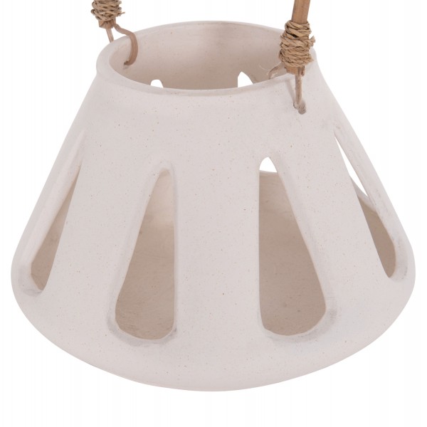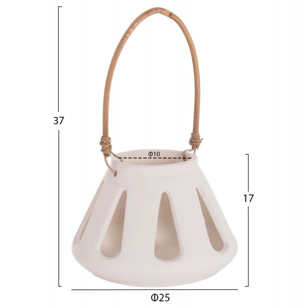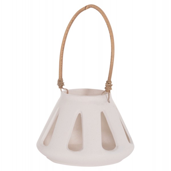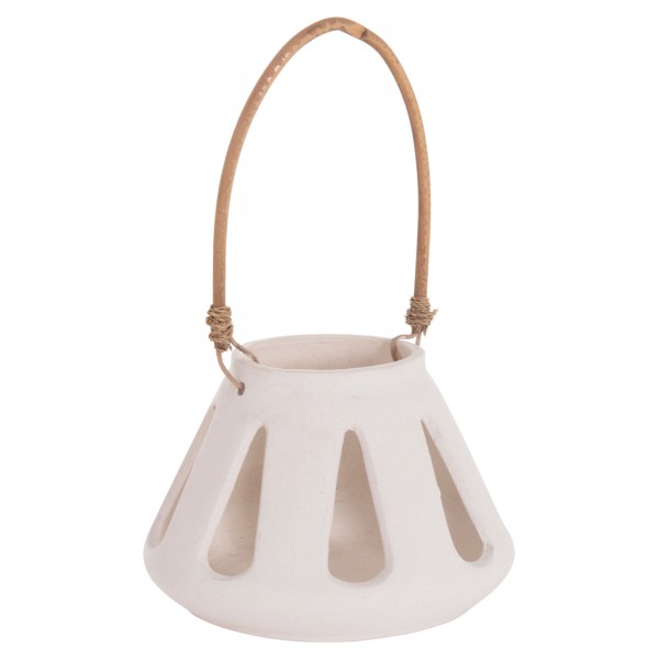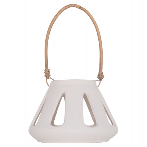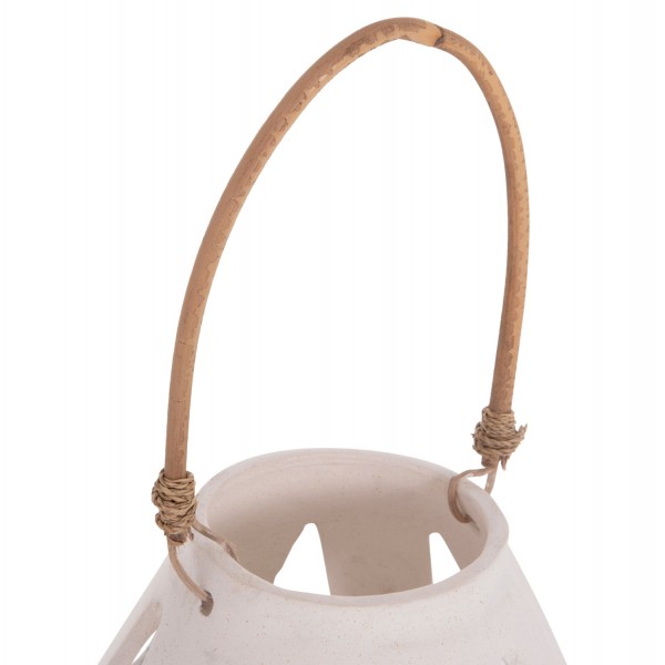 Το χαμηλό επιτραπέζιο διακοσμητικό φανάρι ERANTYL είναι κατασκευασμένο από Fiber Cement σε ΛΕΥΚΟ χρώμα και διαθέτει χερούλι από φυσικό rattan για εύκολη μεταφορά. Το Fiber Cement ΔΕΝ είναι εύφλεκτο, που σημαίνει ότι μπορείτε να τοποθετήσετε αρκετά είδη κεριών, ωστόσο συνιστάται ΠΑΝΤΑ αυτό να γίνεται με μεγάλη προσοχή.