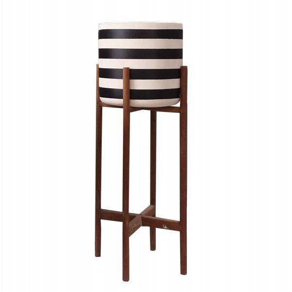 Η γλάστρα εσωτερικού χώρου (κασπό) RENTIL είναι κατασκευασμένη από Fiber Cement σε ΛΕΥΚΟ και ΜΑΥΡΟ χρώμα σε ρίγες. Το ιδιαίτερο χαρακτηριστικό της είναι ότι συνοδεύεται και τοποθετείται σε μια ψηλή χιαστί βάση από ξύλο teak. Συνιστάται η τοποθέτηση εσωτερικού δοχείου εάν πρόκειται να την χρησιμοποιήσετε με νερό!