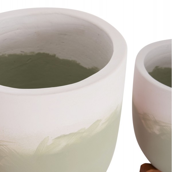 Οι 2 γλάστρες εσωτερικού χώρου SEON είναι κατασκευασμένες από terracotta σε διαφορετικά μεγέθη και σε χρώμα λευκό & ανοιχτό πράσινο. Το ιδιαίτερο χαρακτηριστικό τους είναι ότι συνοδεύονται από όμορφες και πρακτικές βάσεις από ξύλο teak.