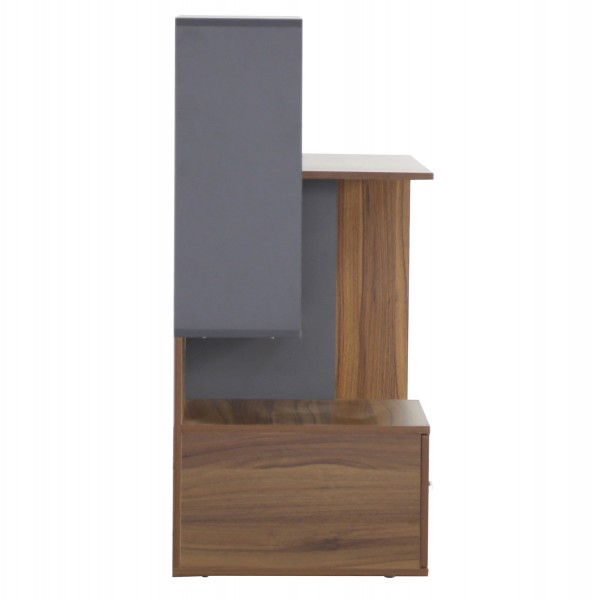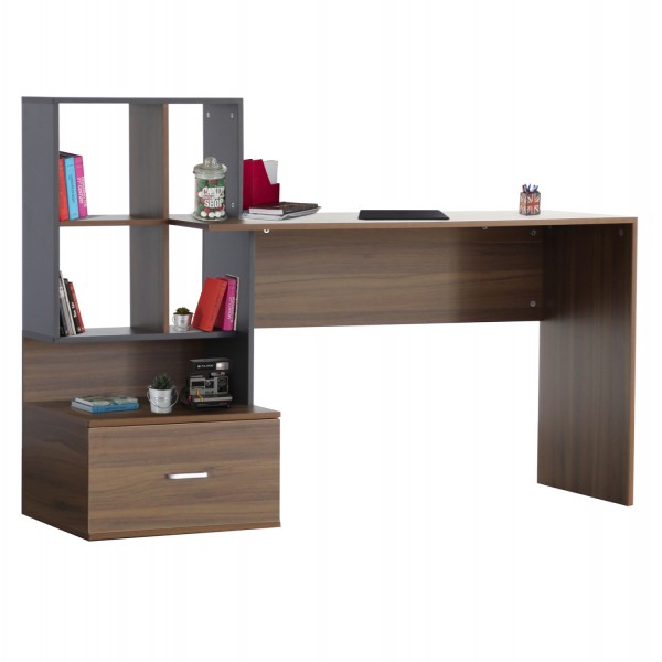 Το γραφείο SYNDYA αποτελεί μια πρακτική και κομψή λύση για οικιακό γραφείο, παιδικό ή εφηβικό δωμάτιο. Ο συνδυασμός καρυδί και γκρι μελαμίνης προσδίδει μοντέρνα αισθητική, ενώ η ενσωματωμένη βιβλιοθήκη προσφέρει άνετους χώρους οργάνωσης και αποθήκευσης, ιδανικούς για βιβλία, διακοσμητικά ή είδη γραφείου.
