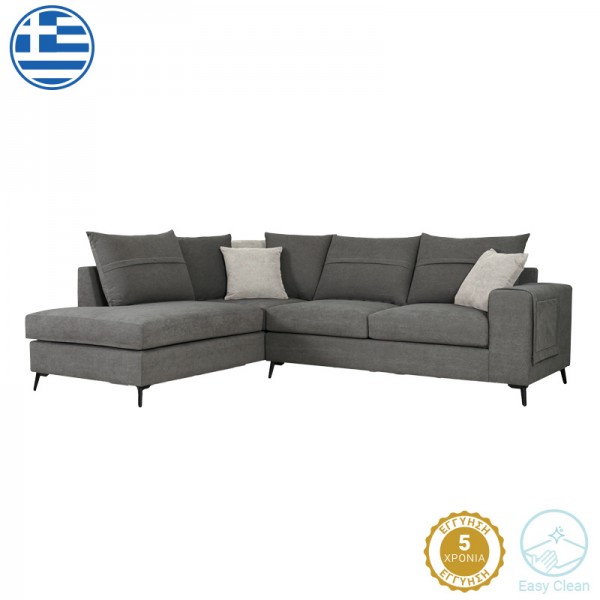 Γωνιακός καναπές δεξιά γωνία Montana pakoworld ποντικί ύφασμα με μαξιλάρια σε απόχρωση ανοιχτό γκρι 275x215x93εκ