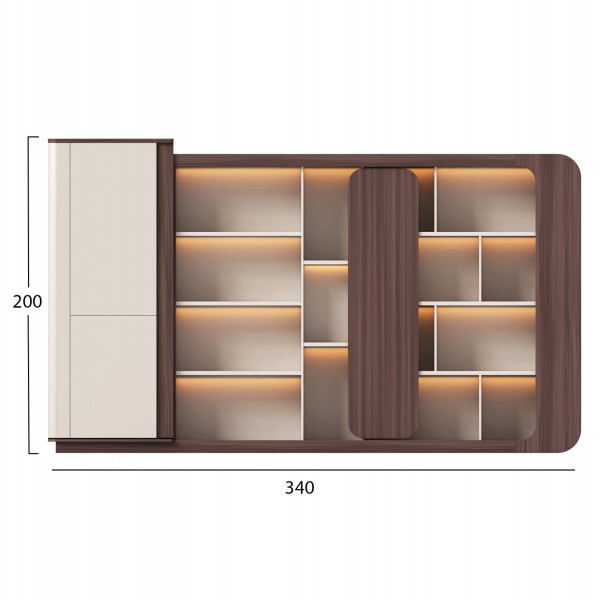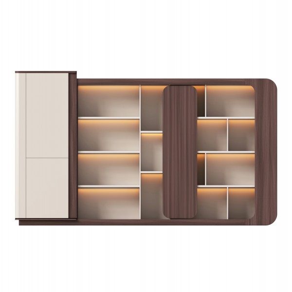 Διαθέτει ενσωματωμένο φωτισμό LED, ο οποίος αναδεικνύει τόσο τα ανοιχτά ράφια όσο και το συνολικό design, δημιουργώντας ένα premium αποτέλεσμα. Οι άφθονοι χώροι αποθήκευσης, τόσο οι ανοιχτοί, όσο και οι κλειστοί, επαρκούν για την άρτια οργάνωση στο γραφείο σας.