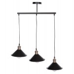 Το κρεμαστό τρίφωτο φωτιστικό οροφής BELL είναι ένα όμορφο κρεμαστό με μαύρη βάση και μαύρα καλώδια κρέμασης. Οι λάμπες είναι σε διαφορετικά ύψη και τα καπέλα είναι μεταλλικά με διακριτικές λεπτομέρειες σε ανοιχτό χάλκινο χρώμα στο επάνω μέρος τους.