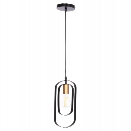 Το κρεμαστό φωτιστικό οροφής BIUT είναι ένα όμορφο κρεμαστό με μαύρη βάση και μαύρο καλώδιο κρέμασης. Η λάμπα τοποθετείται σε ντουί χρυσού χρώματος ενώ αυτό που τραβάει τα βλέμματα είναι το minimal design του καπέλου με τα δύο μεταλλικά πλαίσια.