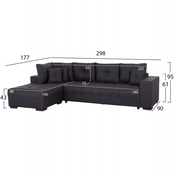 Ο TRENDSTON είναι ένας μεγάλος γωνιακός καναπές-κρεβάτι (ΑΡΙΣΤΕΡΗ ΓΩΝΙΑ). Η επένδυσή του είναι με εξαιρετικής ποιότητας ΓΚΡΙ ύφασμα με καπιτονέ τεχνοτροπία τόσο στα μαξιλάρια όσο και στο κάθισμα, ενώ τα πόδια είναι εξαιρετικά χαμηλά. Διαθέτει 5 μεγάλα μαξιλάρια πλάτης και 3 μικρότερα διακοσμητικά. Το κρεβάτι σχηματίζεται τραβώντας το κάθισμα του κυρίως καναπέ, «ρίχνοντας» ταυτόχρονα μπροστά την κοντή πλάτη. Εκεί ακριβώς δημιουργείται και ένας άκρως ικανοποιητικός αποθηκευτικός χώρος. Τέλος, το μπράτσο στην αριστερή πλευρά είναι φαρδύ και άνετο, ολοκληρώνοντας με τον καλύτερο τρόπο την απαράμιλλη πρακτικότητα αυτού του υπέροχου καναπέ. ΔΙΑΣΤΑΣΕΙΣ: 298x90-177x95Υ εκ. Διαστάσεις καθίσματος: 180-230x52-88x140 εκ. Διαστάσεις πλάτης: 233x52 εκ. 65x52 εκ. Ύψος μπράτσων: 61 εκ. Ύψος καθίσματος: 43 εκ. Ύψος ποδιών: 5 εκ. Διαστάσεις κρεβατιού: 180x135 εκ. Διαστάσεις αποθηκευτικού χώρου: 177x56x24Υ εκ. ΜΕ ΜΙΑ ΜΑΤΙΑ: •Εξαιρετική ποιότητα υλικών κατασκευής •Τα καθίσματα διαθέτουν pocket springs για απαράμιλλη άνεση •Μετατροπή σε κρεβάτι •Ικανοποιητικός αποθηκευτικός χώρος •Φαρδύ μπράτσο •Μεγάλες διαστάσεις •Χαμηλά πόδια *Ο καναπές παραδίδεται αμοντάριστος σε εργοστασιακή συσκευασία ** Η χρωματική απόδοση του προϊόντος ενδέχεται να διαφέρει ελαφρώς σε σχέση με την φωτογραφική απεικόνισή του στην οθόνη σας.