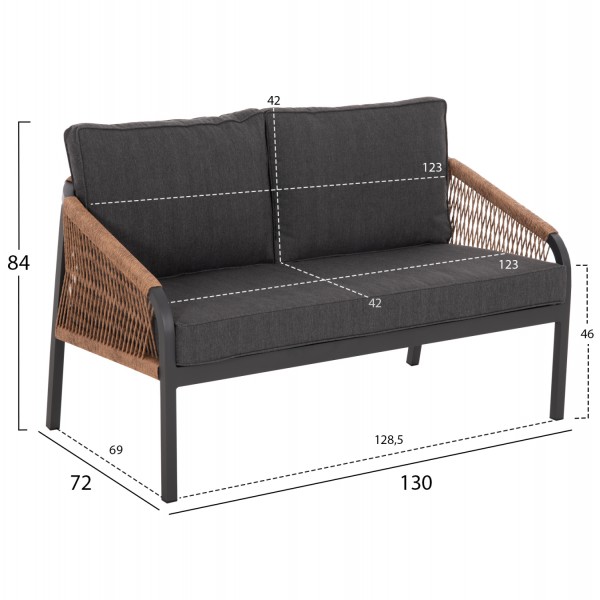 Ο σκελετός του καναπέ είναι από αλουμίνιο βαμμένο με ηλεκτροστατική βαφή. Το αλουμίνιο είναι μέταλλο με εξαιρετικές μηχανικές ιδιότητες και πολύ ανθεκτικό στις διάφορες μορφές διάβρωσης από την φύση του και απαιτεί ελάχιστο κόστος συντήρησης.