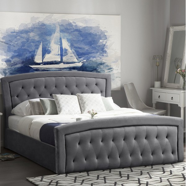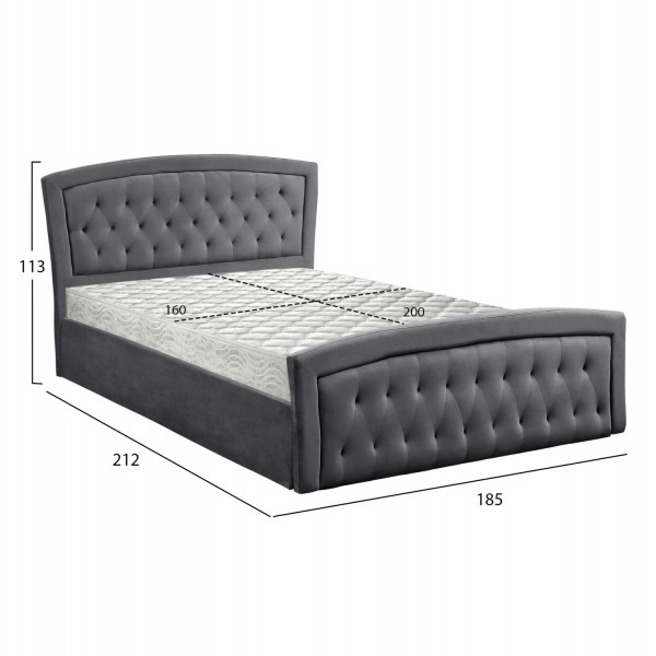 Το υπέρδιπλο κρεβάτι ODELIA είναι επενδυμένο με ΓΚΡΙ βελούδο σε καπιτονέ στυλ. Το στρώμα τοποθετείται σε δύο σειρές ανατομικές τάβλες που ανασηκώνονται με μεταλλικό μηχανισμό ασφαλείας και μεταλλικές λαβές προσφέροντας έναν μεγάλο αποθηκευτικό χώρο.