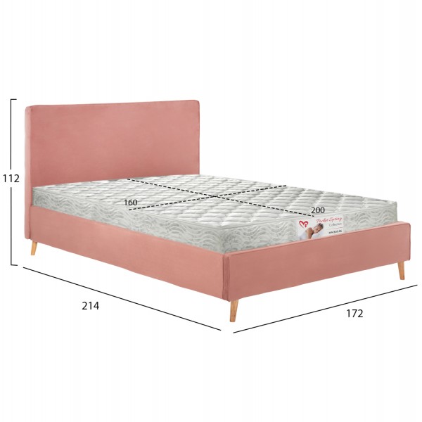 Το υπέρδιπλο κρεβάτι INDRA είναι επενδυμένο με βελούδο σε χρώμα ΣΑΠΙΟ ΜΗΛΟ με ίδιο ρέλι στις ραφές. Το στρώμα που συνοδεύει το κρεβάτι τοποθετείται σε δύο σειρές ανατομικές τάβλες, είναι διπλής όψης και έχει τεχνολογία με pocket springs (ανεξάρτητα ελατήρια). Τα πόδια είναι ξύλινα σε φυσικό χρώμα.