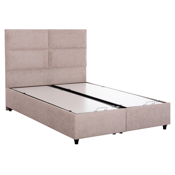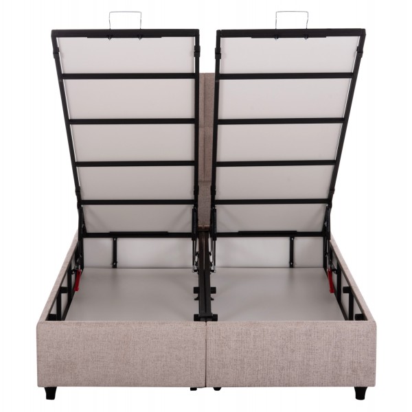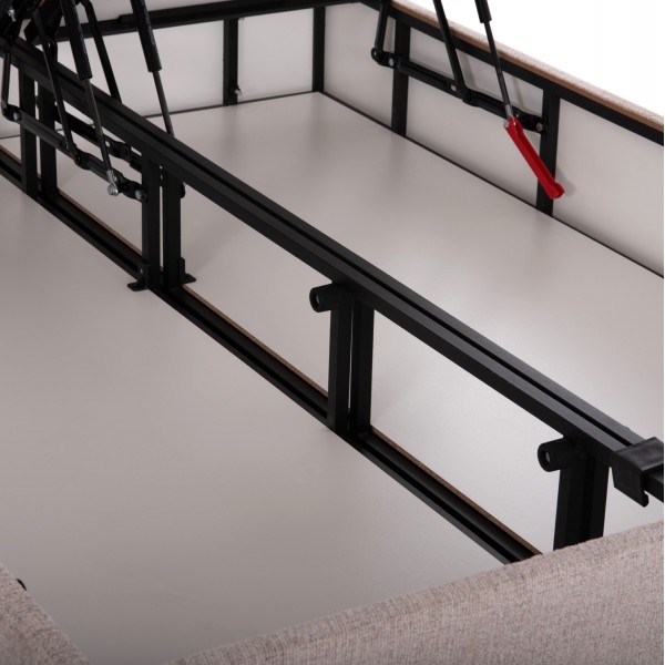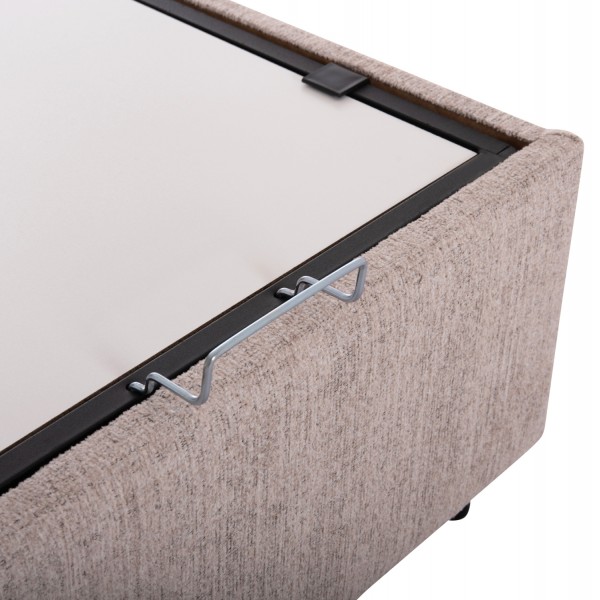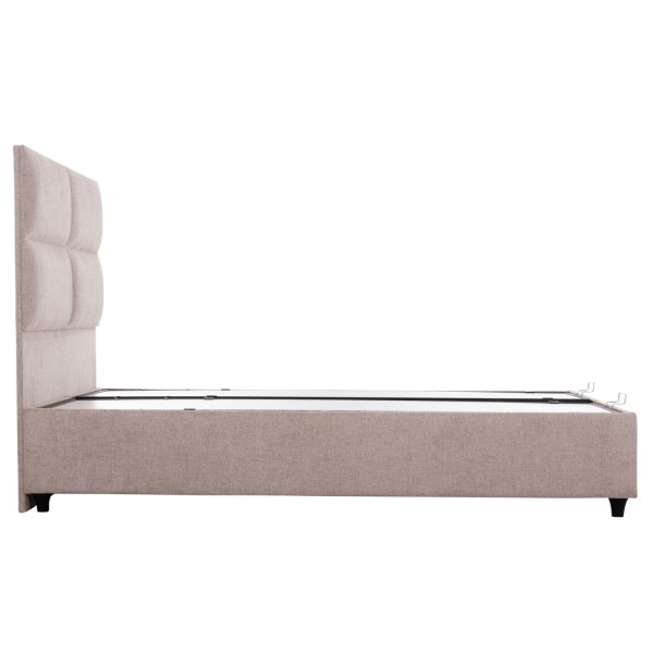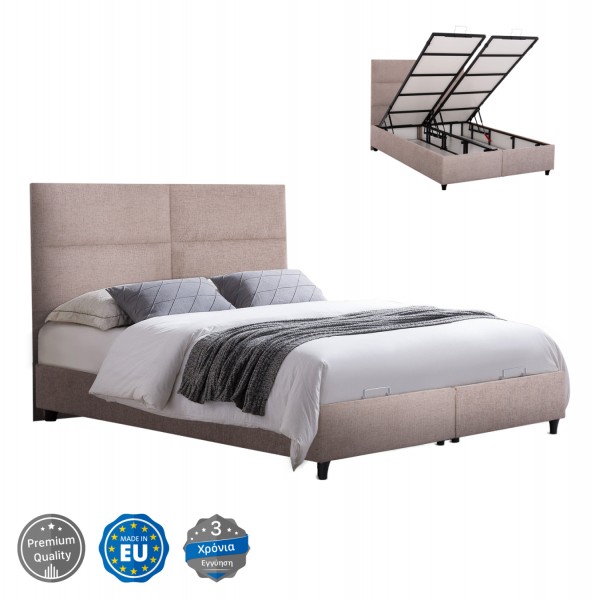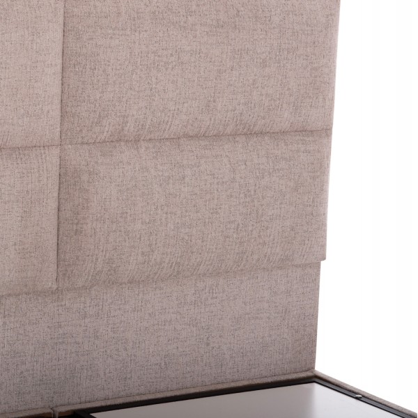 Το κρεβάτι MILO έχει ψηλό κεφαλάρι και επενδυμένο με καπιτονέ τεχνοτροπία σε μεγάλα ορθογώνια, ενώ και όλη η επένδυση του κρεβατιού είναι ζεστό ΜΠΟΥΚΛΕ ύφασμα. Το ουδέτερο ΜΠΕΖ χρώμα σε όλο το κρεβάτι είναι εντυπωσιακό και μπορεί να συνδυαστεί με πληθώρα διακοσμητικών μοτίβων. Όμως, το κύριο χαρακτηριστικό αυτού του κρεβατιού είναι ότι δεν ακολουθεί την κλασική κατασκευή με τις τάβλες του σομιέ για την στήριξη του στρώματος, αλλά αντίθετα αποτελείται από 2 μοριοσανίδες πάνω στις οποίες τοποθετείται το στρώμα! Επιπλέον, η κάθε επιφάνεια από μοριοσανίδα ανασηκώνεται με μεταλλικό μηχανισμό ασφαλείας (gas lifts) και μεταλλικές λαβές προσφέροντας έναν μεγάλο αποθηκευτικό χώρο.