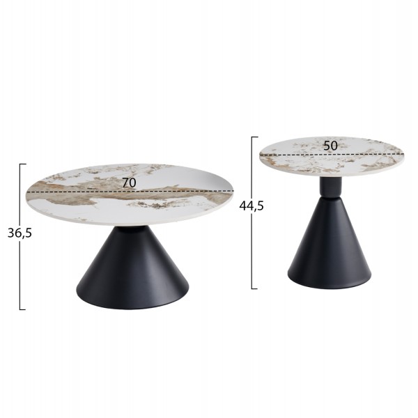 Αυτό το σετ τραπεζιών για το σαλόνι αποτελείται από 2 μεταλλικά τραπεζάκια στρογγυλά διαφορετικών μεγεθών. Οι βάσεις τους έχουν σχήμα κώνου σε ΜΑΥΡΟ χρώμα, ενώ οι επιφάνειες είναι κατασκευασμένες από γυαλιστερό sintered stone σε χρωματικό σχήμα pandora. Ιδανικά τόσο για το σπίτι, όσο και για επαγγελματικούς χώρους.