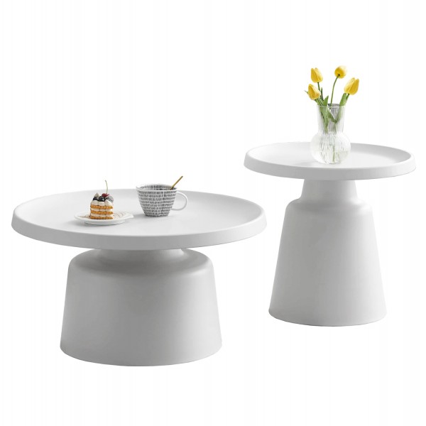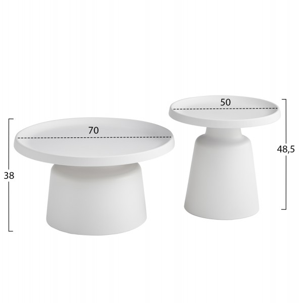 Αυτό το σετ 2 τραπεζιών για το σαλόνι είναι πανέμορφο και πρακτικότατο. Πρόκειται για 2 εξολοκλήρου μεταλλικά τραπεζάκια στρογγυλά διαφορετικών μεγεθών σε ΛΕΥΚΟ χρώμα. Το ένα έχει κωνική βάση που καταλήγει σε όμορφο «λαιμό», και το άλλο έχει κυλινδρική σχεδόν βάση. Ιδανικά τόσο για το σπίτι, όσο και για επαγγελματικούς χώρους. ΔΙΑΣΤΑΣΕΙΣ: Ψηλό: Φ50x48.5Υ εκ. Χαμηλό: Φ70x38Υ εκ. ΥΛΙΚΑ ΚΑΤΑΣΚΕΥΗΣ: Μέταλλο με ηλεκτροστατική βαφή που δίνει τέλειο φινίρισμα και ανθεκτικότητα. ΣΥΝΤΗΡΗΣΗ: Σκούπισμα με ένα μαλακό πανί. Να αποφεύγεται η χρήση χημικών καθαριστικών. ** Η χρωματική απόδοση του προϊόντος ενδέχεται να διαφέρει ελαφρώς σε σχέση με την φωτογραφική απεικόνισή του στην οθόνη σας.