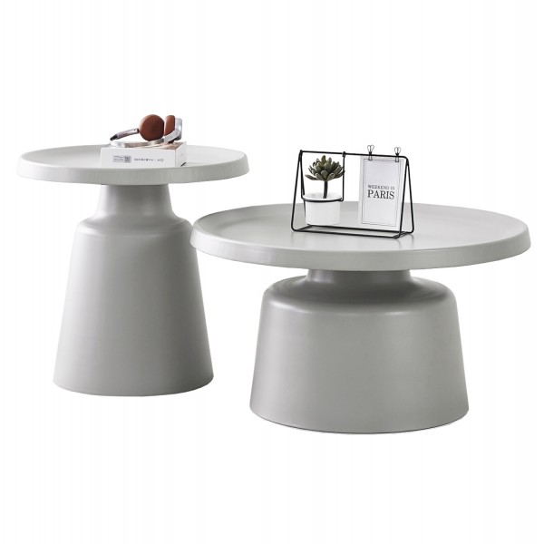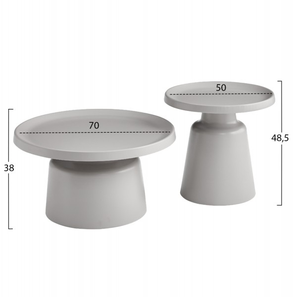 Αυτό το σετ 2 τραπεζιών για το σαλόνι είναι πανέμορφο και πρακτικότατο. Πρόκειται για 2 εξολοκλήρου μεταλλικά τραπεζάκια στρογγυλά διαφορετικών μεγεθών σε ΓΚΡΙ χρώμα. Το ένα έχει κωνική βάση που καταλήγει σε όμορφο «λαιμό», και το άλλο έχει κυλινδρική σχεδόν βάση. Ιδανικά τόσο για το σπίτι, όσο και για επαγγελματικούς χώρους. ΔΙΑΣΤΑΣΕΙΣ: Ψηλό: Φ50x48.5Υ εκ. Χαμηλό: Φ70x38Υ εκ. ΥΛΙΚΑ ΚΑΤΑΣΚΕΥΗΣ: Μέταλλο με ηλεκτροστατική βαφή που δίνει τέλειο φινίρισμα και ανθεκτικότητα. ΣΥΝΤΗΡΗΣΗ: Σκούπισμα με ένα μαλακό πανί. Να αποφεύγεται η χρήση χημικών καθαριστικών. ** Η χρωματική απόδοση του προϊόντος ενδέχεται να διαφέρει ελαφρώς σε σχέση με την φωτογραφική απεικόνισή του στην οθόνη σας.