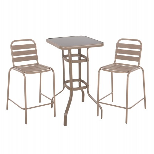 Σετ εξωτερικού χώρου που αποτελείται από 2 σκαμπό μπαρ μεσαίου ύψους και 1 τραπεζάκι μπαρ, όλα σε ΣΑΜΠΑΝΙ χρώμα. Τα σκαμπό διαθέτουν πλάτη και κάθισμα από «φέτες» αλουμινίου, ενώ ο σκελετός τόσο στα σκαμπό όσο και στο τραπέζι είναι μεταλλικός. Το γυαλί στο τραπέζι είναι ασφαλείας.