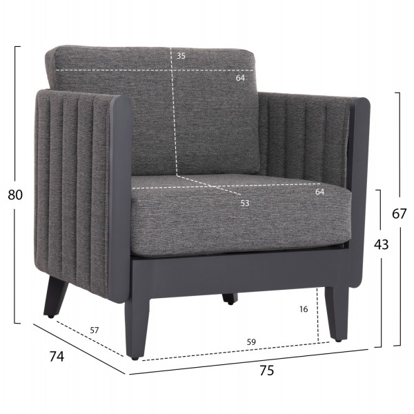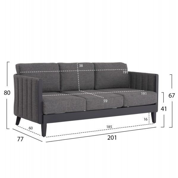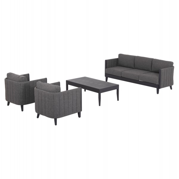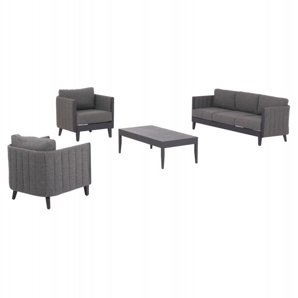 Το σετ σαλόνι εξωτερικού χώρου LARRY αποτελείται από έναν 3-θέσιο καναπέ, ένα τραπεζάκι, και 2 αναπαυτικές πολυθρόνες. Ο σκελετός είναι από αλουμίνιο σε ΓΚΡΙ χρώμα με μαξιλάρια σε ίδιο χρώμα. Το πολυεστερικό ύφασμα, αλλά και η αλουμινένια επιφάνεια στο τραπεζάκι απογειώνουν ποιοτικά όλη την σύνθεση!