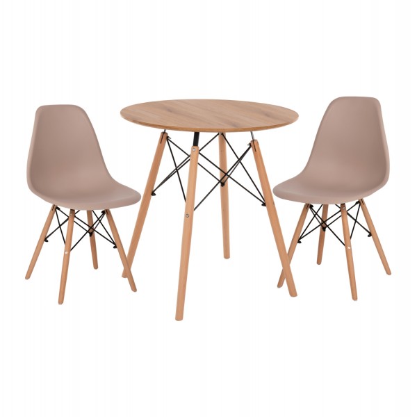 Ένα στρογγυλό τραπέζι με πόδια οξιάς σε ΦΥΣΙΚΟ χρώμα και MDF επιφάνεια σε χρώμα φυσικού ξύλου, και 2 καρέκλες με ενιαία πλάτη και κάθισμα από πολυπροπυλένιο σε ΚΑΠΟΥΤΣΙΝΟ χρώμα και πόδια οξιάς σε φυσικό χρώμα.