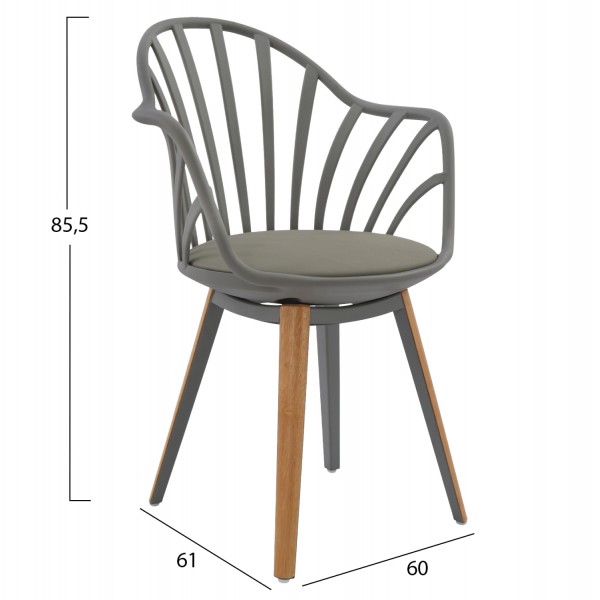 Ένα ορθογώνιο τραπέζι με σκελετό από ξύλο οξιάς σε ΦΥΣΙΚΟ χρώμα και επιφάνεια από MDF σε ΓΚΡΙ χρώμα, και 4 καρέκλες με πλάτη από πολυπροπυλένιο και κάθισμα από PU δέρμα (συνθετικό δέρμα) σε ΓΚΡΙ χρώμα και μεταλλικά πόδια με ξύλινη εξωτερική επένδυση σε φυσικό χρώμα ΞΥΛΟΥ.