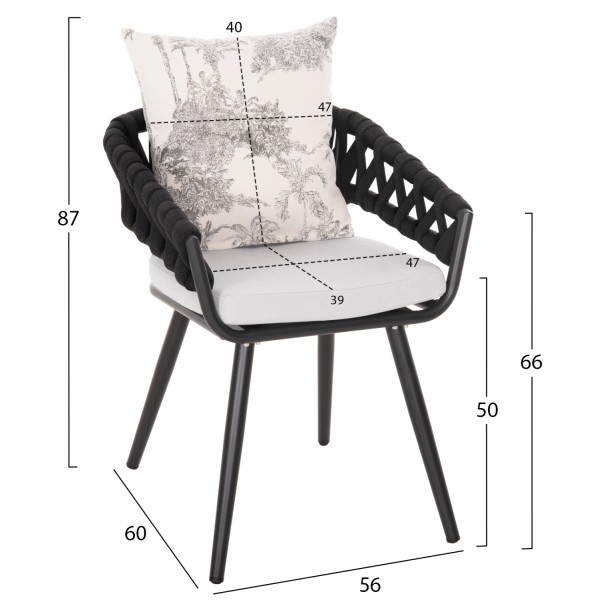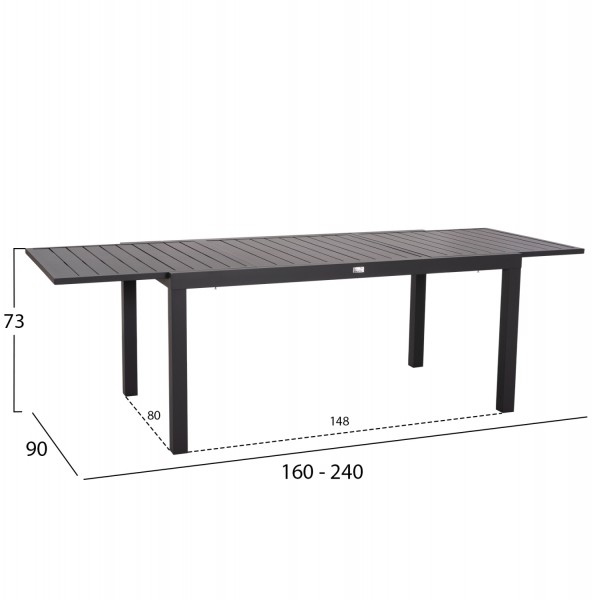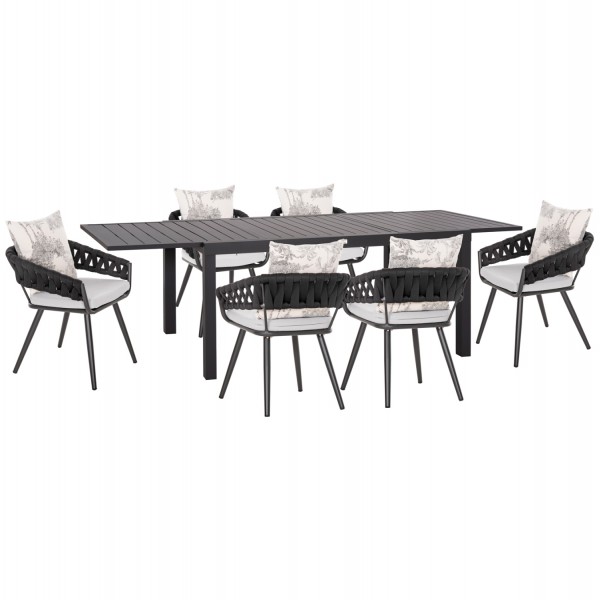Αυτό το σετ τραπεζαρίας εξωτερικού χώρου αποτελείται από ένα ΣΚΟΥΡΟ ΓΚΡΙ επεκτεινόμενο τραπέζι αλουμινίου και 6 ΣΚΟΥΡΕΣ ΓΚΡΙ πολυθρόνες αλουμινίου με ΕΚΡΟΥ μαξιλάρι καθίσματος και επένδυση από συνθετικό σχοινί (terylene) σε ΣΚΟΥΡΟ ΓΚΡΙ. Οι πολυθρόνες είναι και στοιβαζόμενες.
