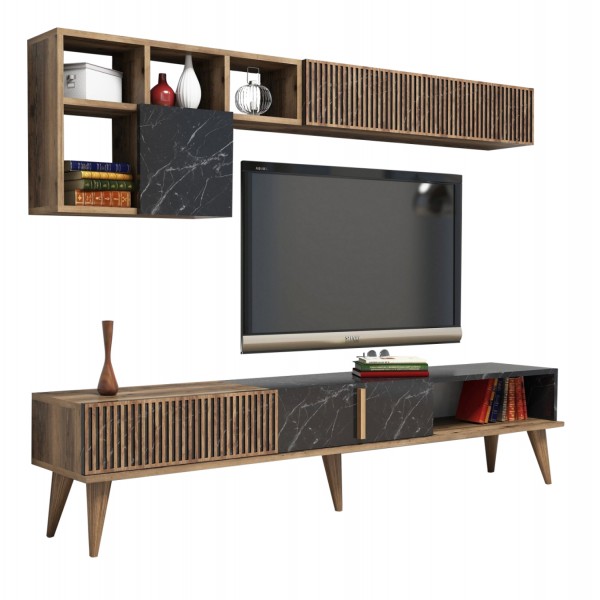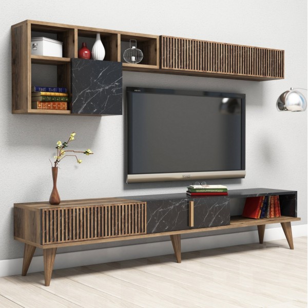 Το ΗΜ9438.03 είναι ένα μοντέρνο και λειτουργικό έπιπλο τηλεόρασης, που θα ομορφύνει το σαλόνι σας! Είναι μακρύ και διαθέτει 2 ντουλάπια με ενιαίο χώρο στην αριστερή πλευρά της κύριας μονάδας δαπέδου που ανοίγουν προς τα κάτω και έναν ανοιχτό χώρο αποθήκευσης στην δεξιά πλευρά. Η σύνθεση ολοκληρώνεται με επιτοίχια ράφια και ντουλάπια που δίνουν άπλετο χώρο είτε για την διακόσμηση σας, είτε για αποθήκευση αντικειμένων. Διαθέτει 4 πόδια στην μονάδα δαπέδου και ένα επιπλέον στο κέντρο για μεγαλύτερη στιβαρότητα, ενώ το έπιπλο έρχεται σε μια πανέμορφη διχρωμία καρυδί με ΜΑΥΡΟ ΜΑΡΜΑΡΟ, και οι διαστάσεις του είναι κατάλληλες για όλες τις τηλεοράσεις εάν θέλετε η τηλεόρασή σας να στηρίζεται σε βάση. Πρόκειται για μια κομψή και ολοκληρωμένη πρόταση για το σαλόνι σας! ΔΙΑΣΤΑΣΕΙΣ: Μήκος: 180 εκ. Ύψος: 40 εκ. Βάθος: 35 εκ. Ύψος ποδιού: 20 εκ. ΡΑΦΙ ΤΟΙΧΟΥ 1: Μήκος: 81 εκ. Ύψος: 48,6 εκ. Βάθος: 20 εκ. ΡΑΦΙ ΤΟΙΧΟΥ 2: Μήκος: 180 εκ. Βάθος: 20 εκ. Πάχος μελαμίνης: 18 χλστ. (1,8 εκ.) ΥΛΙΚΑ ΚΑΤΑΣΚΕΥΗΣ: Ολόκληρο το έπιπλο είναι κατασκευασμένο από μελαμίνη εξαιρετικής ποιότητας. Η μελαμίνη είναι είδος ξύλου σε μορφή μοριοσανίδας. Ως υλικό είναι πολύ ανθεκτικό και με μεγάλη σκληρότητα. Άρα, πρόκειται για ένα συνθετικό υλικό με πολύ σκληρή επιφάνεια, με αποτέλεσμα να είναι πολύ ανθεκτική στις γρατζουνιές, στην τριβή και τους λεκέδες. ΣΥΝΤΗΡΗΣΗ: Η μελαμίνη καθαρίζεται πάρα πολύ εύκολα από τους λεκέδες χάρη στην σκληρή της επιφάνεια. Μπορείτε να σκουπίσετε όλες τις επιφάνειες με ένα υγρό πανί και αυτό είναι αρκετό. Σε επίμονους λεκέδες μπορείτε να χρησιμοποιήσετε ένα ήπιο καθαριστικό. ΠΛΕΟΝΕΚΤΗΜΑΤΑ: Αυτή η σύνθεση τηλεόρασης είναι όμορφη και φυσικά πρακτική. Διαθέτει μια μεγάλη επιφάνεια και αρκετό χώρο για αποθήκευση διάφορων πραγμάτων. Μπορεί να συνδυαστεί με πολλά στυλ διακόσμησης χάρη στα όμορφα χρώματά της. Μια ιδανική πρόταση για το σπίτι με τιμή που δεν θα σας αφήσει να κοιτάξετε αλλού! ΤΟ ΠΡΟΙΟΝ ΔΙΑΤΙΘΕΤΑΙ ΑΜΟΝΤΑΡΙΣΤΟ ΣΕ ΕΡΓΟΣΤΑΣΙΑΚΗ ΣΥΣΚΕΥΑΣΙΑ