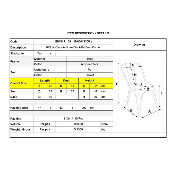 Καρέκλα-Pro, Στοιβαζόμενη, Μέταλλο Βαφή Antique Black, Pu Camel