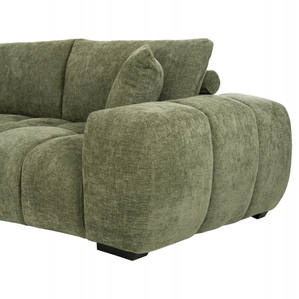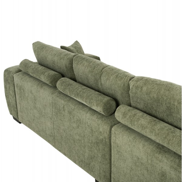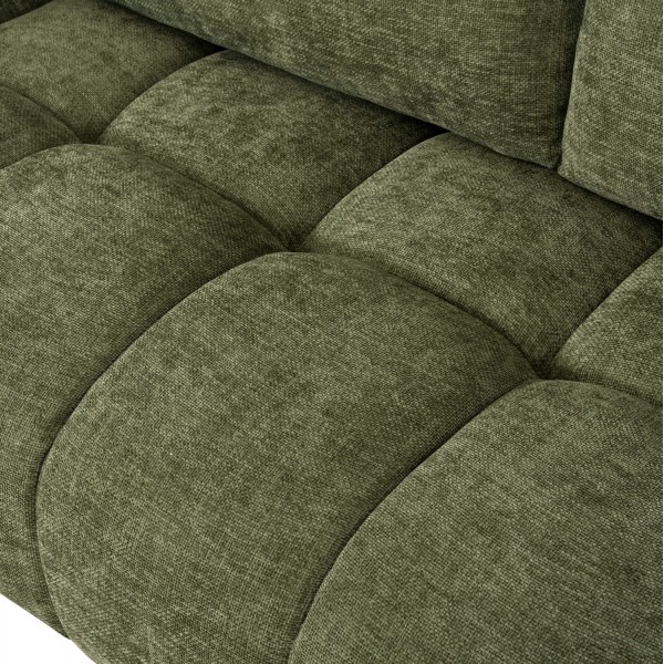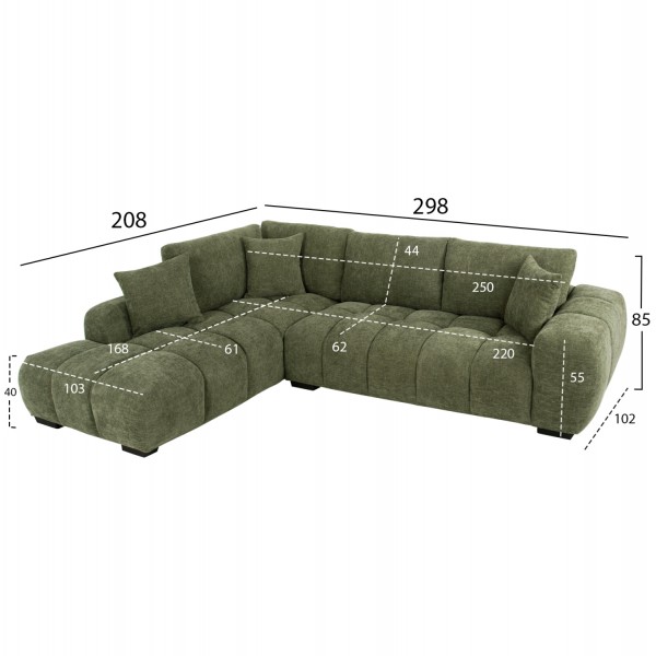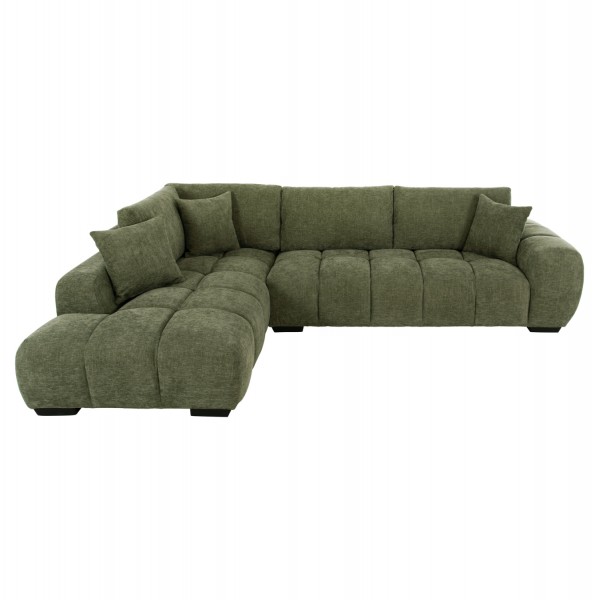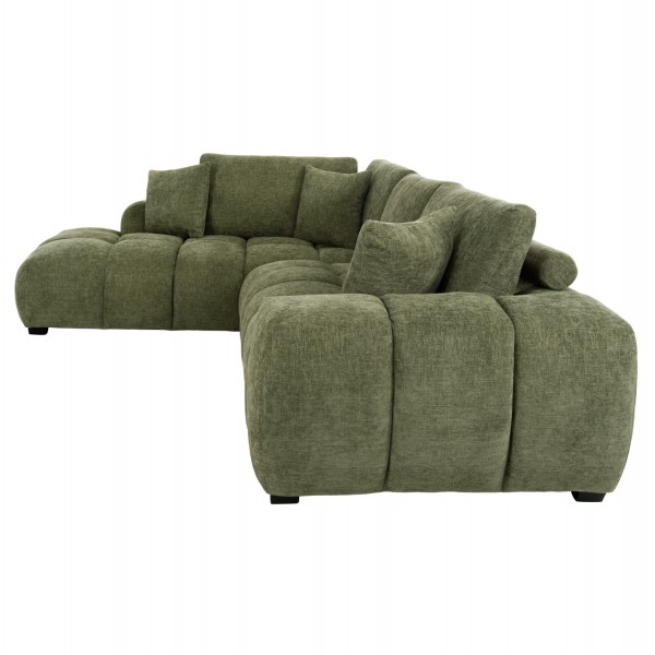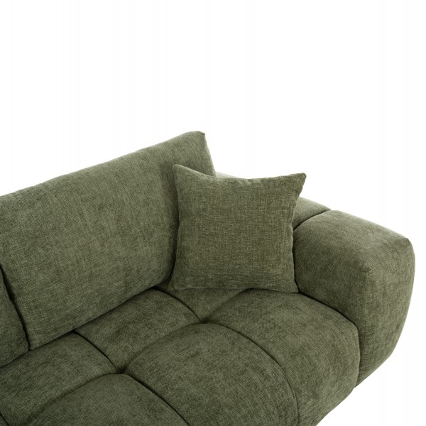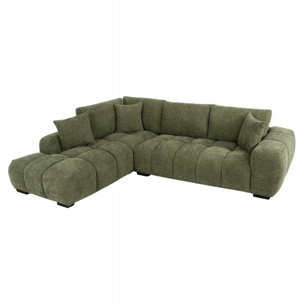 Σας παρουσιάζουμε τον COVEN, έναν υπέροχο μεγάλο καναπέ σε διαμόρφωση ΑΡΙΣΤΕΡΗΣ γωνίας (όπως τον κοιτάς) επενδυμένο με ποιοτικό ύφασμα σε ΠΡΑΣΙΝΟ χρώμα. Ξεκινώντας από το design, ο καναπές φτάνει μέχρι πολύ χαμηλά σε στυλ «ποδιάς» και διαθέτει φαρδιά χαμηλά πόδια-βάσεις σε μαύρο χρώμα. Τα μπράτσα είναι εντυπωσιακά φαρδιά, ενώ η επένδυση είναι σε στυλ καπιτονέ με τις έντονες ραφές! Το κομμάτι που σχηματίζει την γωνία είναι ίδιας αισθητικής και ενώνεται με τον κυρίως καναπέ με κατακόρυφους αναρτήρες πάνελ. Η πλάτη είναι χαμηλή και διαθέτει 4 μαξιλάρια πλάτης με «καραμέλες»(μακρόστενα κυλινδρικά μαξιλάρια) στο πίσω μέρος τους για καλύτερη στήριξη, αλλά και 3 μικρότερα διακοσμητικά μαξιλαράκια. Το κάθισμα διαθέτει γεμίσματα αφρού μεσαίας σκληρότητας σε συνδυασμό με ελατήρια pocket springs, προσφέροντας απαράμιλλη άνεση. Και φυσικά, σας προσφέρουμε αυτόν τον καναπέ με εγγύηση σκελετού 3 ετών!