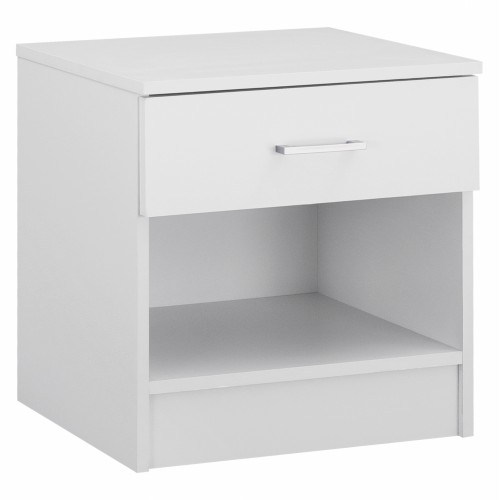 Κομοδίνο μελαμίνης με ένα συρτάρι σε λευκή απόχρωση. Ένα εύχρηστο και ιδανικό έπιπλο για τη κρεβατοκάμαρα σας ή το φοιτητικό σας σπίτι.