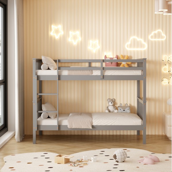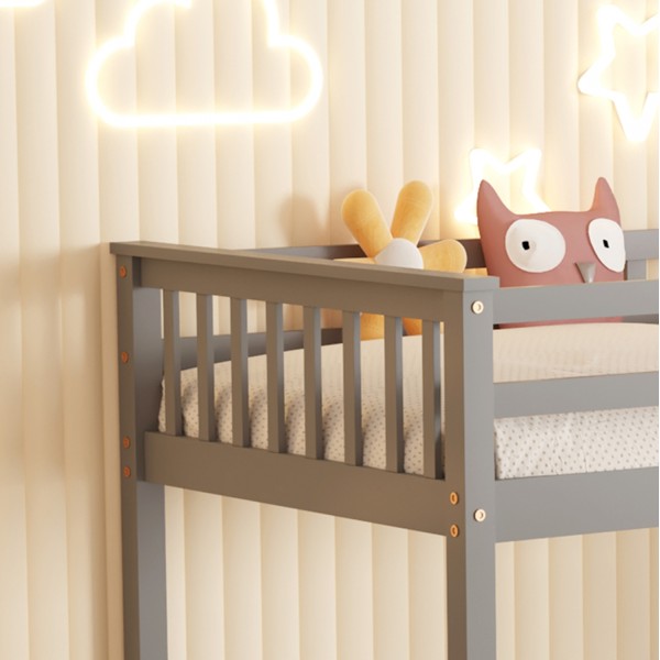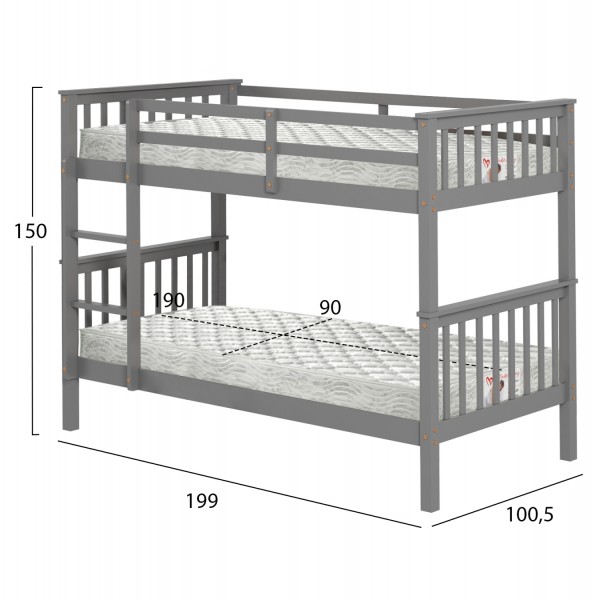 Η παιδική κουκέτα LANTAI σε διάσταση για στρώματα 90x190εκ, είναι κατασκευασμένη από ξύλο πεύκου σε ΓΚΡΙ χρώμα. Η κουκέτα με τα ψηλά σχετικά πόδια, διαθέτει περιμετρικά κάγκελα και σκάλα πρόσβασης στο επάνω κρεβάτι, ενώ τα στρώματα τοποθετούνται σε τάβλες από κόντρα-πλακέ ξυλεία.