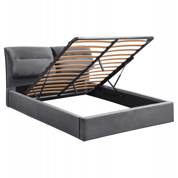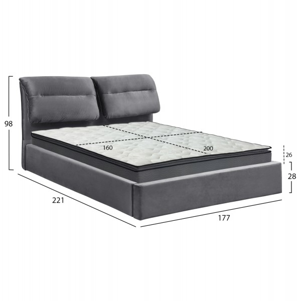 •Το κρεβάτι KENDRA σε διάσταση για στρώμα 160x200 εκ, είναι επαρκέστατα άνετο για να χωρέσουν δύο άτομα. Έχει κεφαλάρι με δύο μαξιλάρια δεμένα πάνω του (αποσπώμενα με φερμουάρ), για να προσφέρει άνεση όταν κάθεστε για να διαβάσετε το βιβλίο σας, ενώ ολόκληρη η επένδυσή του έχει γίνει με εξαιρετικής ποιότητας βελούδινο ύφασμα σε ΓΚΡΙ χρώμα. Το στρώμα «κάθεται» πάνω σε δύο σειρές από ανατομικές τάβλες, ακολουθώντας τον παραδοσιακό τρόπο κατασκευής κρεβατιού. Επιπλέον, το τελάρο με τις τάβλες στήριξης του στρώματος ανασηκώνεται με μεταλλικό μηχανισμό ασφαλείας με 2 αμορτισέρ προσφέροντας έναν μεγάλο αποθηκευτικό χώρο, ο οποίος φυσικά καταλαμβάνει όλο τον χώρο μέχρι το δάπεδο.