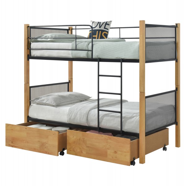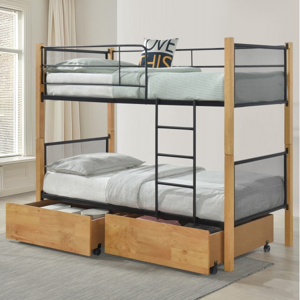 Σας παρουσιάζουμε τo κρεβάτι-κουκέτα RAYVEN σε συνδυασμό ξύλου- μετάλλου για μονά στρώματα 90x190εκ. Τα 4 πόδια-κολώνες του κρεβατιού είναι τα ξύλινα κομμάτια της σύνθεσης σε χρώμα ΟΞΙΑΣ, ενώ το κεφαλάρι, το ποδαρικό, τα πλαϊνά, η σκάλα, τα κάγκελα, και οι τάβλες στήριξης του στρώματος είναι όλα μεταλλικά σε ΜΑΥΡΟ χρώμα. Τα κεφαλάρια μάλιστα αποτελούνται από μεταλλική «σίτα», όπως και τα ποδαρικά. Η πρόσβαση στο επάνω κρεβάτι γίνεται με μια μεταλλική σκάλα που τοποθετείται βιδωτή στον σκελετό. Στο επάνω κρεβάτι υπάρχουν πλαϊνά προστατευτικά κάγκελα που προσφέρουν ασφάλεια από πτώσεις. Η πρακτικότητά του τονίζεται ακόμα περισσότερο χάρη στα δύο συρτάρια δαπέδου με ροδάκια, που τοποθετούνται κάτω από το κρεβάτι, και διαθέτουν όμορφη πρόσοψη μελαμίνης σε χρώμα παρόμοιο με τον σκελετό του κρεβατιού. Ιδανικό τόσο για το σπίτι, όσο και για επαγγελματικούς χώρους, όπως AirBnB, ξενοδοχεία κτλ.