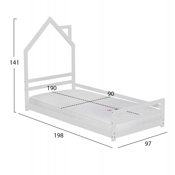 Το παιδικό κρεβάτι HOUSER τύπου Montessori σε διάσταση για στρώμα 90x190εκ, είναι κατασκευασμένο από ξύλο πεύκου σε ΛΕΥΚΟ χρώμα. Tο κεφαλάρι έχει σχήμα σπιτιού με καμινάδα και τα πόδια είναι εξαιρετικά χαμηλά, ενώ το στρώμα τοποθετείται σε τάβλες από κόντρα-πλακέ ξυλεία.