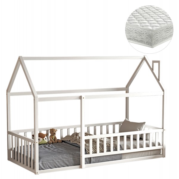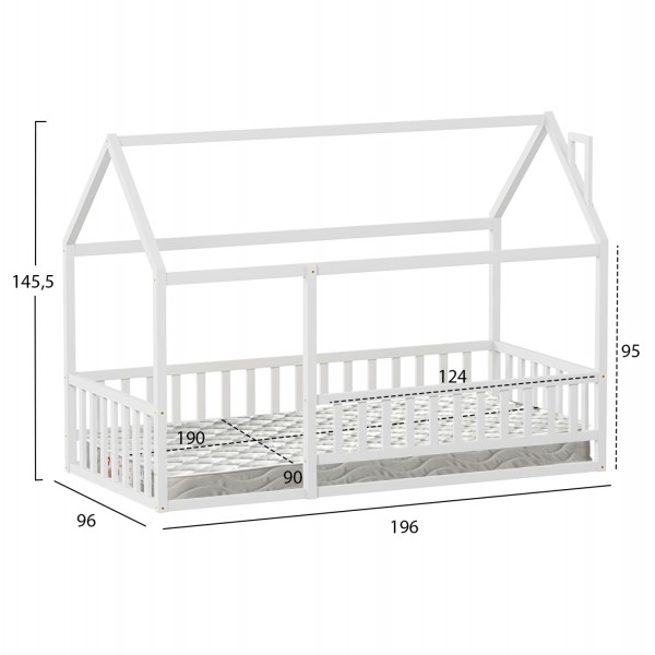 Το παιδικό κρεβάτι HOUSER τύπου Montessori σε διάσταση για στρώμα 90x190εκ, είναι κατασκευασμένο από ξύλο πεύκου σε ΛΕΥΚΟ χρώμα. Όλο το κρεβάτι που πατάει στο πάτωμα έχει σχήμα σπιτιού με καμινάδα και περιμετρικά κάγκελα, ενώ το στρώμα τοποθετείται σε τάβλες από κόντρα-πλακέ ξυλεία.