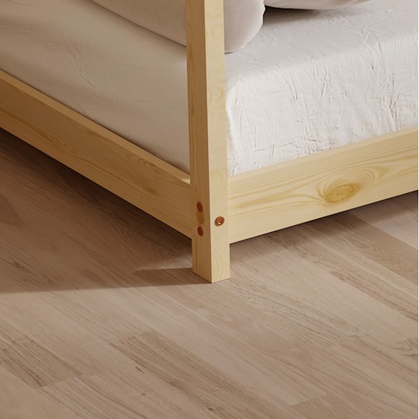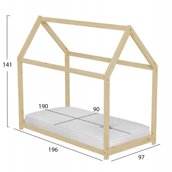 Το παιδικό κρεβάτι PEPE τύπου Montessori σε διάσταση για στρώμα 90x190εκ, είναι κατασκευασμένο από ξύλο πεύκου σε ΦΥΣΙΚΟ χρώμα. Όλο το κρεβάτι έχει σχήμα σπιτιού με εξαιρετικά χαμηλά πόδια, ενώ το στρώμα τοποθετείται σε τάβλες από κόντρα-πλακέ ξυλεία.