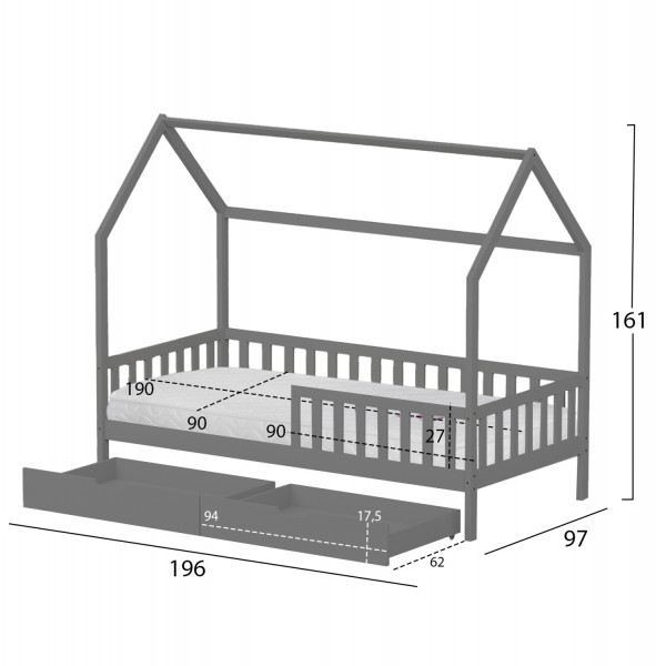 Το παιδικό κρεβάτι PHYLLIS τύπου Montessori σε διάσταση για στρώμα 90x190εκ, είναι κατασκευασμένο από ξύλο πεύκου σε ΓΚΡΙ χρώμα. Όλο το κρεβάτι έχει σχήμα σπιτιού με περιμετρικά κάγκελα και διαθέτει 2 συρτάρια στο κάτω μέρος ως αποθηκευτικό χώρο, ενώ το στρώμα τοποθετείται σε τάβλες από κόντρα-πλακέ ξυλεία.