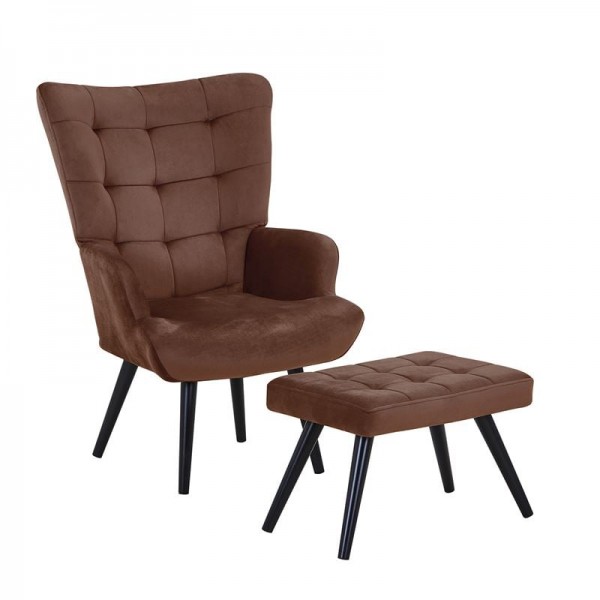 LOBBY Πολυθρόνα - Μπερζέρα με Σκαμπό - Υποπόδιο, Μέταλλο Μαύρο, Ύφασμα Velure Καφέ