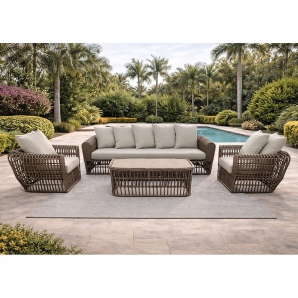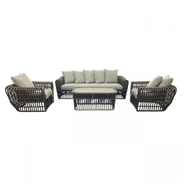 LOPEZ Set Σαλόνι Κήπου: 3θέσ +2 Πολυθρόνες+1 Τραπεζάκι, Μέταλλο-Wicker Καφέ,Μαξιλ.Μπεζ