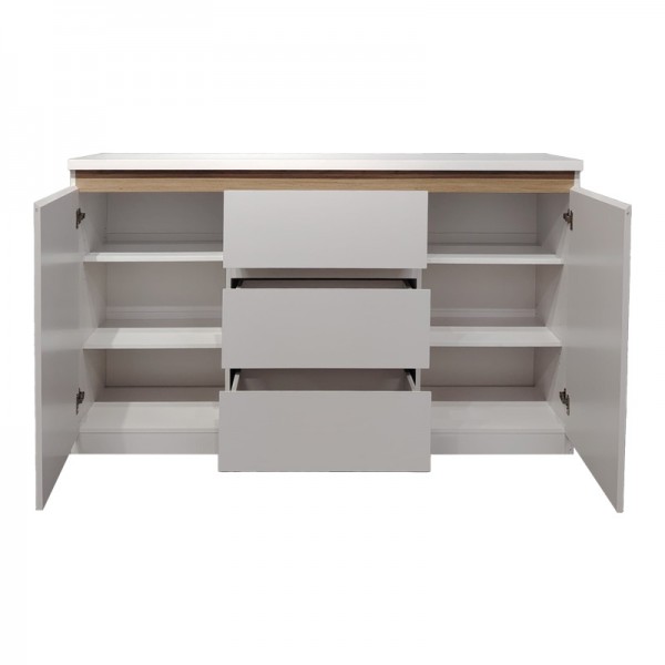 Ανανεώστε την αισθητική του χώρου σας με τον κομψό και λειτουργικό μπουφέ Chiemo. Αυτό το έπιπλο αποθήκευσης συνδυάζει τον σύγχρονο μινιμαλισμό με την πρακτικότητα, προσφέροντας άφθονο χώρο για την οργάνωση των αντικειμένων σας. Διαθέτει δύο ευρύχωρα ντουλάπια με εσωτερικά ράφια και τρία άνετα συρτάρια, παρέχοντας ευελιξία για την αποθήκευση σερβίτσιων, λευκών ειδών ή άλλων προσωπικών αντικειμένων.Τεχνικά χαρακτηριστικά:
