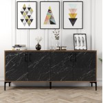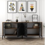 Ο μπουφές ΗΜ9428.03 είναι ένα επιβλητικό έπιπλο όπου κι αν τον τοποθετήσετε. Έχει ψηλά μαύρα μεταλλικά πόδια και δύο μεγάλα ντουλάπια με ράφι, που ανοίγουν με διπλές πόρτες. Το μήκος του εξασφαλίζει ότι η επιφάνεια του είναι μεγάλη και αρκετή για τοποθέτηση πολλών αντικειμένων. Το χρώμα όλης της κατασκευής είναι καρυδί, ενώ όλες οι πόρτες έχουν εφέ μαύρου μαρμάρου. Ο μπουφές αυτός θα σας ενθουσιάσει! Τι είναι όμως ο μπουφές; Ο μπουφές είναι ένα άκρως πρακτικό έπιπλο, αφού στους αποθηκευτικούς του χώρους μπορούμε να βάλουμε από σερβίτσια πιάτων και ποτήρια, μέχρι κεριά και διάφορα άλλα χρηστικά αντικείμενα που έχουμε στο σπίτι μας, ώστε να είναι τακτοποιημένα και να μη δημιουργούν ακαταστασία στο χώρο. INFO: Το έπιπλο μπουφές έχει μακρά ιστορία, καθώς φαίνεται πως μας ήρθε από την Σκανδιναβία, όπου αρχικά χρησιμοποιούνταν για το σημείο που σερβίρονταν αλκοολούχα ποτά. Η ιδέα υιοθετήθηκε από τους Γάλλους που, με τη γνωστή τους κομψότητα, την πήγαν ένα βήμα παρακάτω και σταδιακά γνώρισε παγκόσμια αναγνώριση. Στην Ελλάδα αγαπάμε πολύ τους μπουφέδες, τους οποίους συναντάμε όλες τις τελευταίες δεκαετίες, σε διάφορα σχέδια, μεγέθη και στιλ.