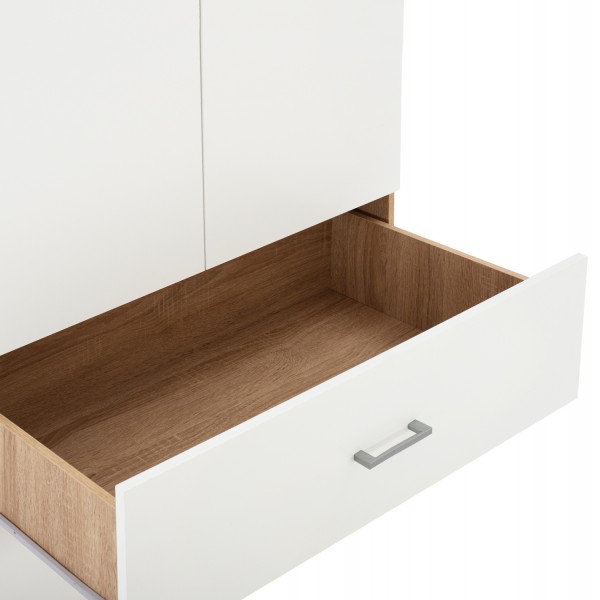 Γνωρίστε την 4-φυλλη ντουλάπα-γκαρνταρόμπα REINA. Πρόκειται για μια μεγάλη ντουλάπα με 4 πόρτες, και στο εσωτερικό της υπάρχει μόνο μια INOX μπάρα για κρέμαση ρούχων. Κάτω ακριβώς από τον χώρο της γκαρνταρόμπας υπάρχουν και 4 ευρύχωρα συρτάρια. Οι πόρτες αλλά και τα συρτάρια ανοίγουν με καλαίσθητα ασημί χερούλια. Είναι κατασκευασμένη από μελαμίνη σε ΛΕΥΚΟ-SONAMA χρώμα και αισθητικά μπορεί να ταιριάξει με πολλά άλλα στυλ, χάρη και στις «καθαρές» γραμμές της.