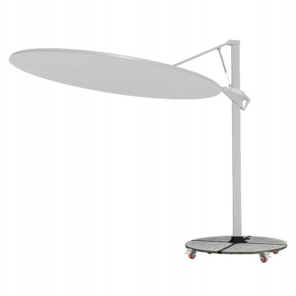 Η βάση των 120kg από φυσικό γρανίτη, χωρισμένη σε τέσσερα τμήματα μέσα σε πλαίσιο τύπου σταυρού, προσφέρει απόλυτη σταθερότητα, ενώ τα γαλβανισμένα χαλύβδινα ροδάκια επιτρέπουν την εύκολη μετακίνηση της ομπρέλας σε οποιοδήποτε σημείο του χώρου. Όλα τα μέρη της είναι βαμμένα σε φωτεινό ΛΕΥΚΟ χρώμα, δημιουργώντας μια σύγχρονη και διακριτική αισθητική.