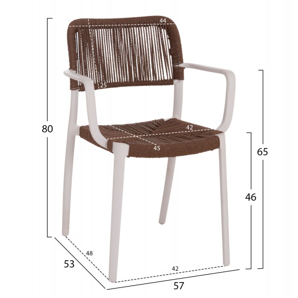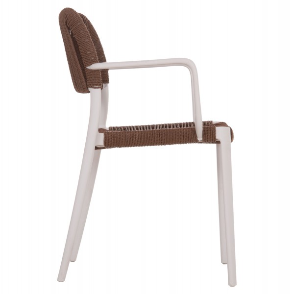 Η πολυθρόνα τραπεζαρίας εξωτερικού χώρου STRIDER συνδυάζει σύγχρονη αισθητική και πρακτικότητα, αποτελώντας ιδανική επιλογή για βεράντες, κήπους και επαγγελματικούς εξωτερικούς χώρους. Ο ανθεκτικός σκελετός από πολυπροπυλένιο σε ΛΕΥΚΗ απόχρωση συνδυάζεται αρμονικά με κάθισμα και πλάτη από ΚΑΦΕ σχοινί, προσφέροντας μοντέρνο χαρακτήρα και άνεση.