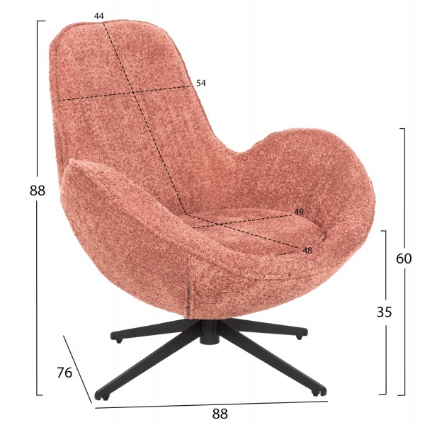Σας παρουσιάζουμε την περιστρεφόμενη πολυθρόνα BRYNN σε ΡΟΖ χρώμα που είναι μια από τις καινούργιες προσθήκες στην γκάμα μας. Στηρίζεται σε μια μαύρη μεταλλική τετράνυχη βάση στην οποία είναι τοποθετημένος ο πίρος περιστροφής. Η επένδυση της πολυθρόνας έχει γίνει με υψηλής ποιότητας μπουκλέ ύφασμα και το κάθισμα είναι αναπαυτικό ανταποκρινόμενο στον χαρακτήρα της πολυθρόνας, η οποία είναι μοντέρνα συνδυάζοντας στιλ και άνεση. Τοποθετήστε την δίπλα στο τζάκι, σε ένα παράθυρο ή ακόμα και στο υπνοδωμάτιό σας, και αφεθείτε στην «αγκαλιά» της.