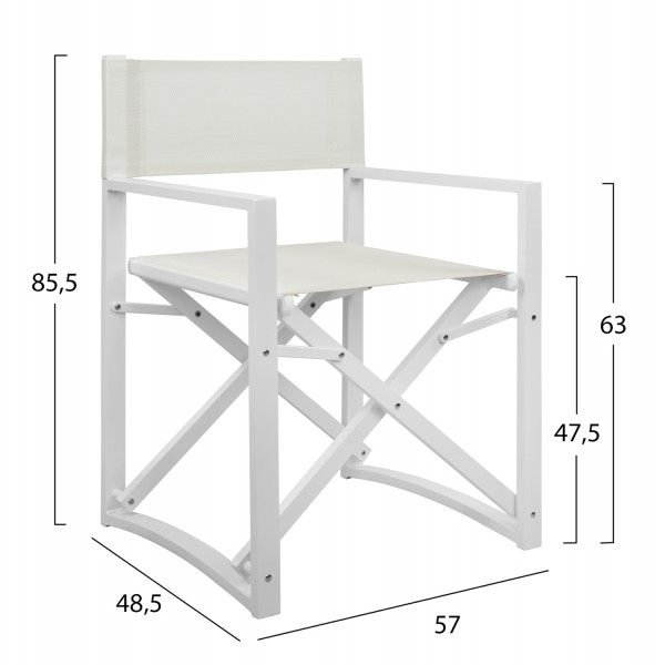 Πολυθρόνα σκηνοθέτου κατασκευασμένη από σκελετό αλουμινίου σε λευκή απόχρωση και πανί από textline.