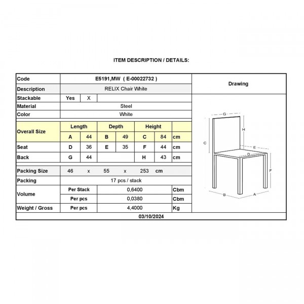 RELIX Καρέκλα Στοιβαζόμενη Μέταλλο Βαφή Άσπρο c542794