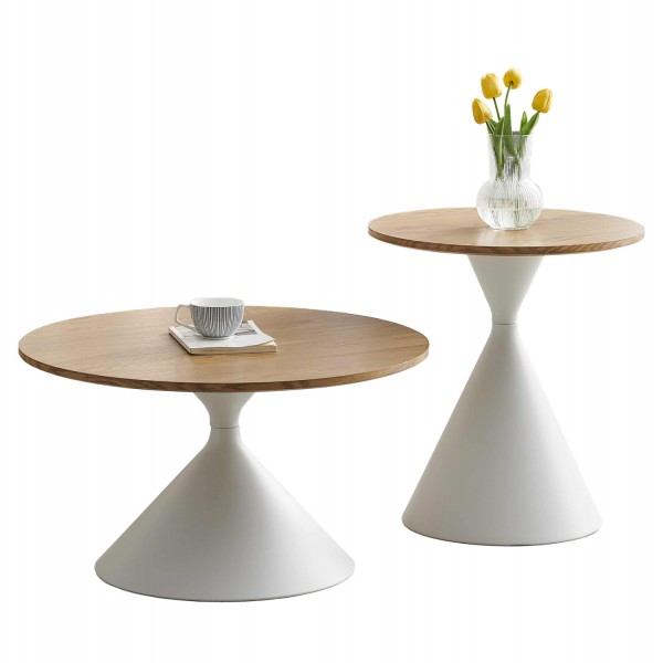 Αυτό το σετ τραπεζιών για το σαλόνι αποτελείται από 2 μεταλλικά τραπεζάκια στρογγυλά διαφορετικών μεγεθών. Οι βάσεις τους έχουν σχήμα κλεψύδρας σε ΛΕΥΚΟ ματ χρώμα, ενώ οι επιφάνειες είναι κατασκευασμένες από MDF σε φυσικό χρώμα. Ιδανικά τόσο για το σπίτι, όσο και για επαγγελματικούς χώρους.