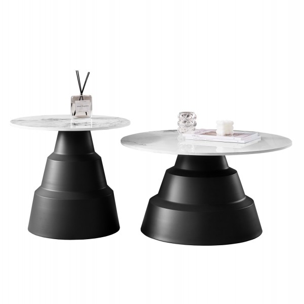 Αυτό το σετ τραπεζιών για το σαλόνι αποτελείται από 2 μεταλλικά τραπεζάκια στρογγυλά διαφορετικών μεγεθών. Οι βάσεις τους έχουν σχήμα διαβαθμισμένου κώνου σε ΜΑΥΡΟ χρώμα, ενώ οι επιφάνειες είναι κατασκευασμένες από γυαλιστερό sintered stone σε χρωματικό σχήμα SNOW WHITE. Ιδανικά τόσο για το σπίτι, όσο και για επαγγελματικούς χώρους.