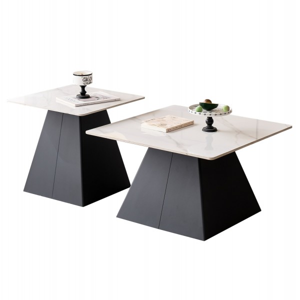 Αυτό το σετ τραπεζιών για το σαλόνι αποτελείται από 2 μεταλλικά τετράγωνα τραπεζάκια διαφορετικών μεγεθών. Οι βάσεις τους έχουν σχήμα πυραμίδας σε ΜΑΥΡΟ ματ χρώμα, ενώ οι επιφάνειες είναι κατασκευασμένες από γυαλιστερό sintered stone σε χρώμα SNOW WHITE. Ιδανικά τόσο για το σπίτι, όσο και για επαγγελματικούς χώρους.