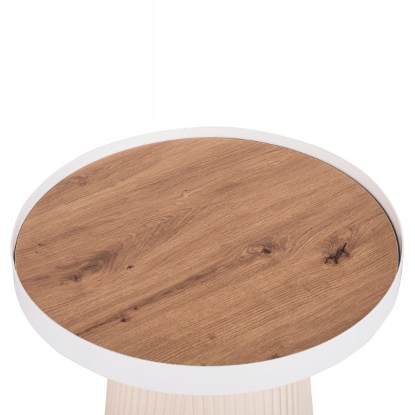 Το σετ 2 στρογγυλών τραπεζιών σαλονιού DUNCAN αποτελείται από ένα χαμηλό σχετικά τραπέζι με κεραμική επιφάνεια σε χρωματισμό ΚΡΕΜ ΜΑΡΜΑΡΟΥ μονταρισμένη σε mdf πάνελ, με βάση κωνική κατασκευασμένη εξολοκλήρου από mdf, με όμορφες πτυχώσεις, και ένα λίγο ψηλότερο τραπέζι με επιφάνεια από MDF σε χρωματισμό ΦΥΣΙΚΟΥ ΞΥΛΟΥ μονταρισμένη σε έναν μεταλλικό δίσκο με υπερυψωμένη περίμετρο, επίσης με κωνική βάση με πτυχώσεις. Το σετ σε ΚΡΕΜ αποχρώσεις συνδυάζει πρακτικότητα με διακριτική πολυτέλεια και αναβαθμίζει κάθε σαλόνι.